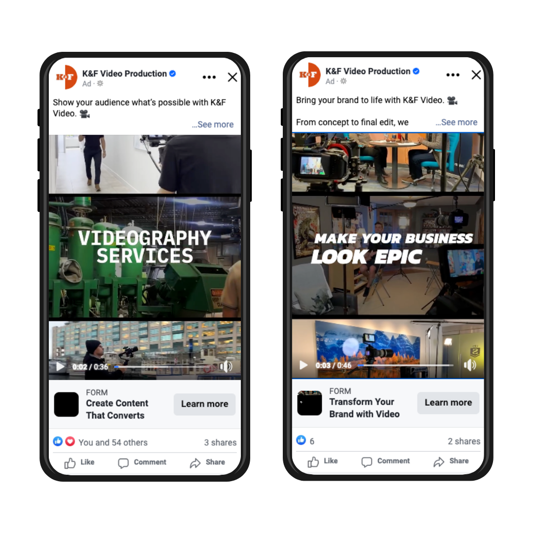 We ran targeted Meta Ads campaigns for KF Video, focused on increasing brand visibility and generating inquiries for their videography and video production services. Using a mix of high-impact visuals, video clips, and strong messaging, we showcased KF Video’s quality, creativity, and professionalism across Facebook and Instagram.