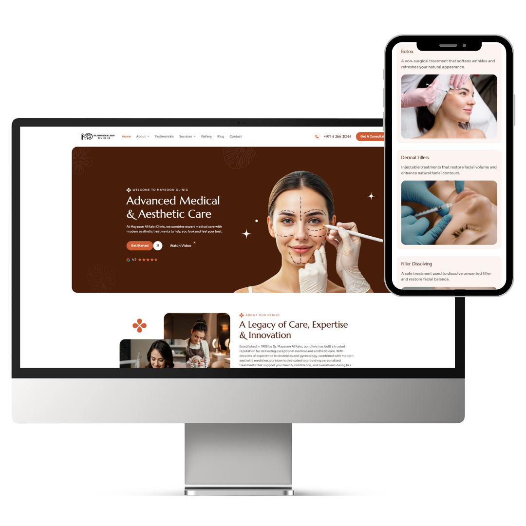 The website features a clean, elegant design, detailed service pages, and intuitive navigation that allows visitors to easily learn about treatments, the clinic’s expertise, and how to book appointments. Optimized for both desktop and mobile devices, the site helps Maysoon Clinic present their services with credibility while making it simple for patients to explore treatments and get in touch for consultations.